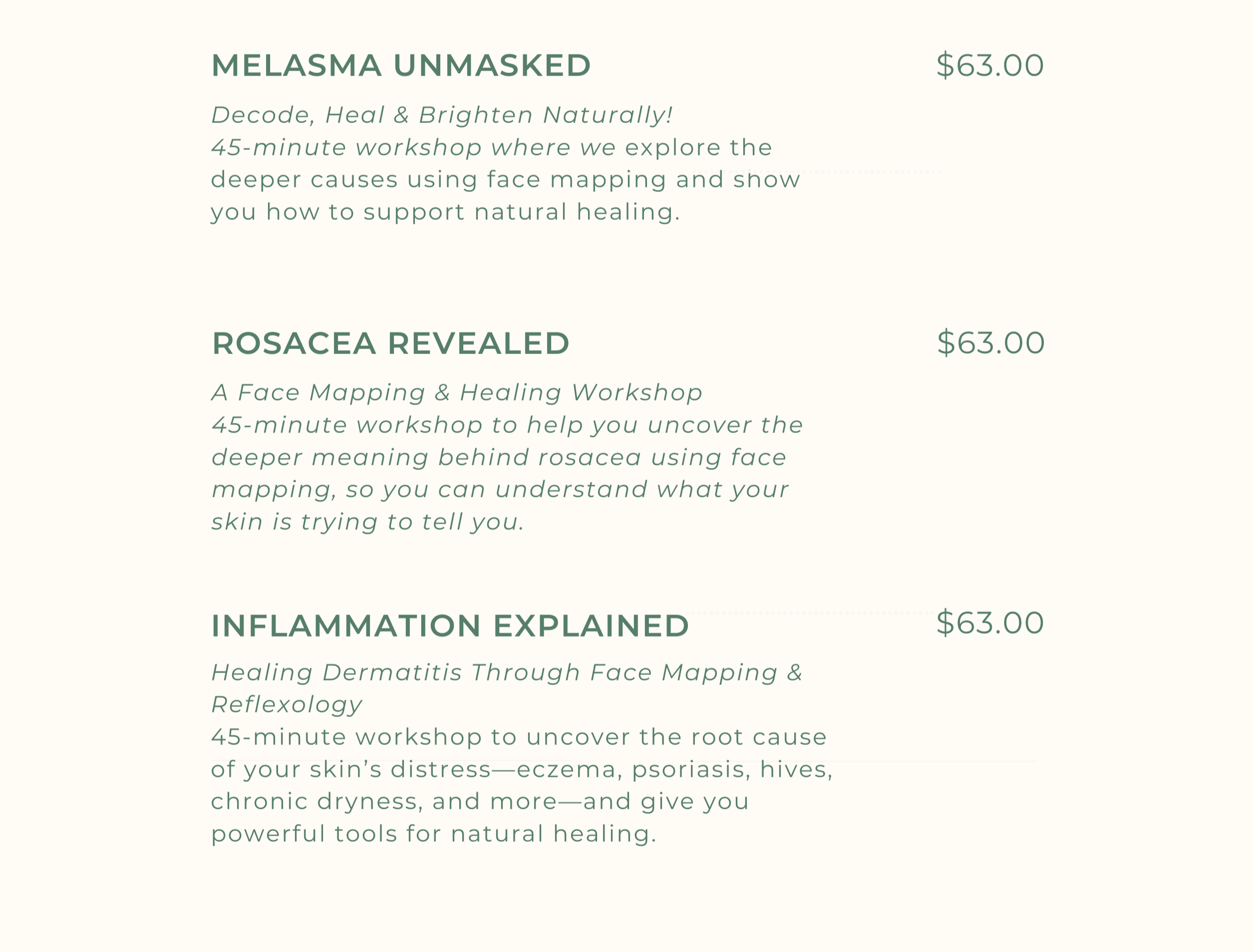 A healing bundle of 3 workshops designed to decode your skin’s symptoms and restore balance from within using face mapping, reflexology, and holistic practices.